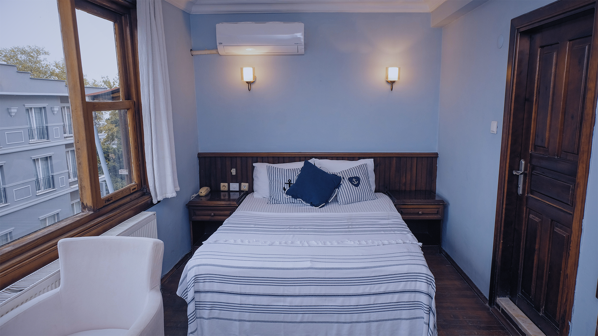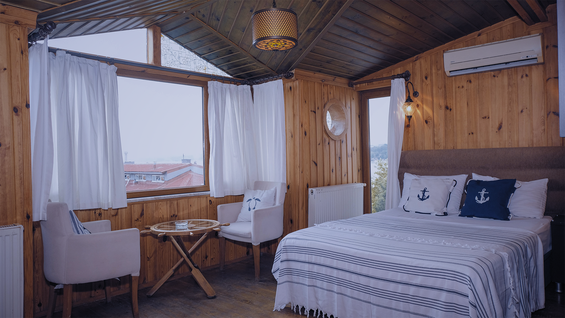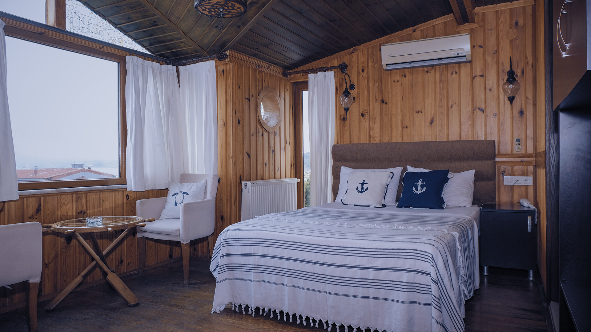 Denizci Otel’de double odalar, eşsiz deniz manzarasıyla misafirlerine huzurlu bir konaklama sunar. Ahşap dokusunun sıcaklığıyla tasarlanmış bu odalar, denize karşı saatlerce kitap okumanıza ve Sinop surlarını izlerken tarihin izlerini hayal etmenize olanak tanır. Konforlu yatakları sayesinde günün yorgunluğunu atabilir, Sinop Limanı’nın canlı atmosferi eşliğinde hem dinlenip hem de şehrin ruhunu hissedebilirsiniz.